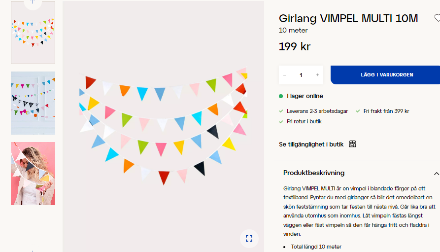 På varje produkts sida kan du se lagerstatus för just den produkten i våra butiker. Tryck på Se tillgänglighet i butik för att se om den specifika varan finns i lager i din närmsta butik.